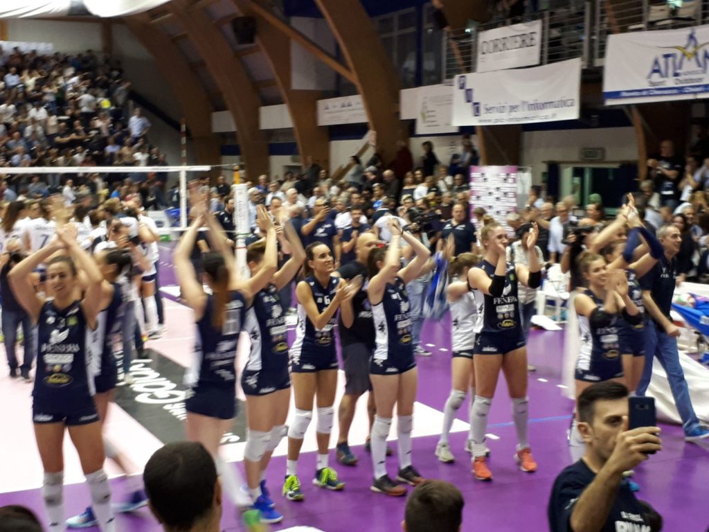 Quarto set – Sul 10-10, dopo l’ingresso di Lualdi per Middleborn, le padrone di casa strappano a 18-13 (Angelina) dando l’impressioni di avere ormai la partita in mano, ma un punto alla volta le ospiti recuperano sfiorando il pareggio sul 21-20. L’errore in battuta di Zanette fa respirare il Fenera. Il concitato finale è deciso sul 23-22 da un tap-in vincente di Akrari e dall’errore in attacco di Markovic.