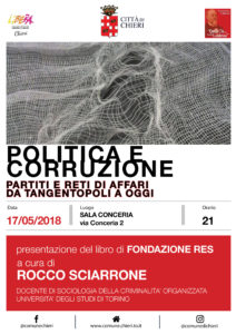 Giovedì prossimo 17 maggio alle ore 21 nuovo appuntamento con gli incontri dell’associazione culturale “Quelli che… Cesare Lombroso”, il gruppo chierese che propone relatori di fama per discutere di temi attuali riguardanti la legalità, di cui è presidente Biagio Fabrizio Carillo.Giovedì in Sala Conceria Rocco Sciarrone, docente di Sociologia della criminalità organizzata all’Università di Torino, presenterà il suo recente e completissimo studio su “Politica e corruzione, partiti e reti di affari da Tangentopoli ad oggi”, un argomento scottante.Vi attendiamo numerosi. L’evento è organizzato in collaborazione con il Comune di Chieri e l’associazione “Libera”