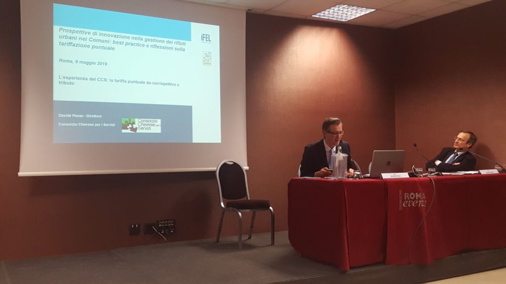 Lo scorso 9 maggio 2018 il Direttore del Consorzio Chierese Davide Pavan ha partecipato come relatore presso la sede congressuale Roma Eventi Fontana di Trevi ad un importante convegno organizzato da Anci ed Ifel dal titolo: “Prospettive di innovazione nella gestione dei rifiuti urbani nei Comuni: best practice e riflessioni sulla tariffazione puntuale”. Il Consorzio Chierese, selezionato dagli organizzatori tra le migliori best-practices italiane in materia di gestione rifiuti e tariffa puntuale, ha raccontato la propria esperienza davanti ad un foltissimo uditorio di oltre 150 persone provenienti da Comuni, aziende e università ed alla presenza di autorevoli soggetti istituzionali e stakeholders quali Claudia Rotunno (Dirigente Ministero dell’Economia e Finanze), Filippo Brandolini (Vicepresidente Utilitalia), Marcella Pavan (Direttore Direzione Ciclo dei Rifiuti urbani e assimilati ARERA) e Luigi Lovecchio (tributarista del Sole 24 ore), oltre naturalmente ai vertici di ANCI ed IFEL (Pierciro Galeone – Direttore Fondazione Ifel, Ivan Stomeo, Delegato ANCI ai rifiuti, Andrea Ferri, Responsabile finanza locale ANCI/IFEL, Guido Castelli Presidente Fondazione Ifel).
