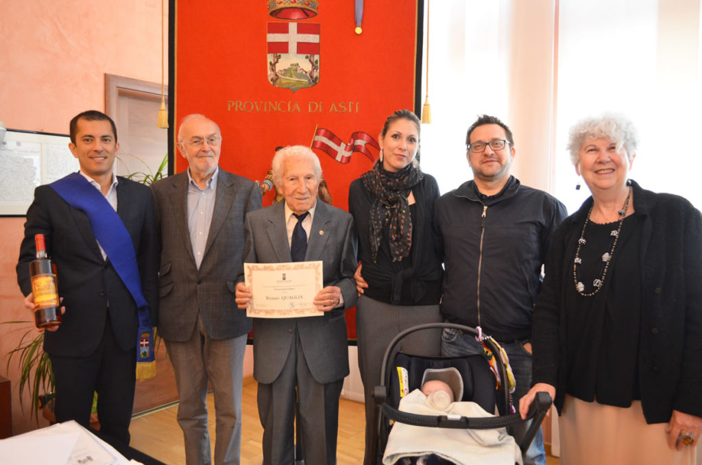 Nell’incontro Gabusi ha consegnato al Mar. sc. Renato Quaglia il riconoscimento di “Patriarca dell’Astigiano”, con l’omaggio dell’Amaro del Centenario della ditta Punto Bere di Canelli, partner dell’iniziativa. Il neo centenario esprimendo gratitudine per l’attenzione ricevuta, ha salutato il Presidente Gabusi con l’augurio di un arrivederci al prossimo anno perché “non metto limite alla provvidenza” dice il neo centenario Renato.