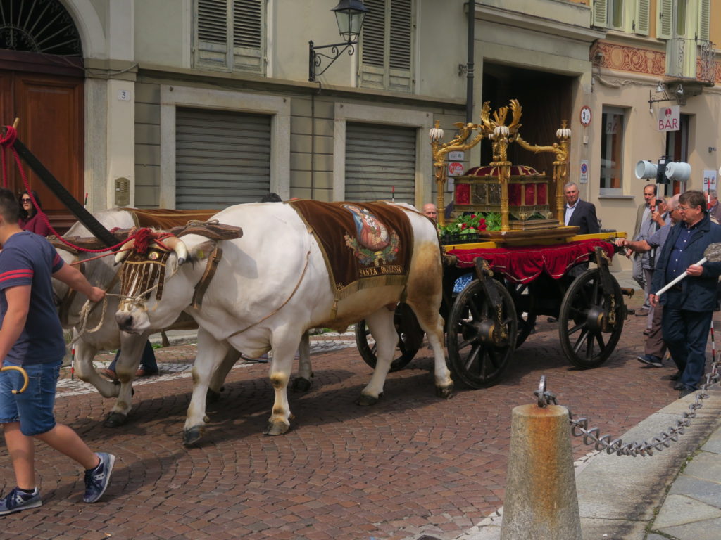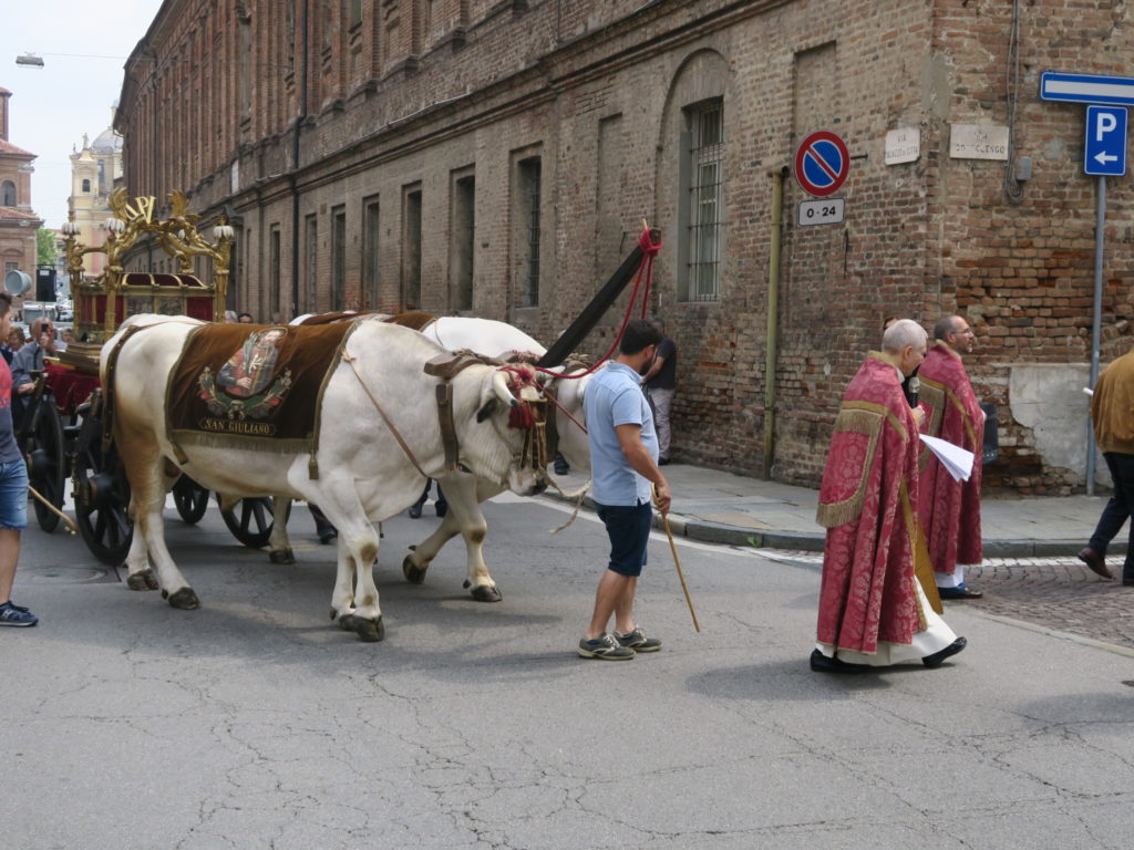 Stamattina, 19 maggio, in Duomo, alle 10,30, è stata celebrata la festa dei Santi Giuliano e Basilissa, protettori degli agricoltori chieresi. Dopo la Messa, processione con la preziosa urna delle reliquie dei due Santi issata sul tradizionale carro trainato da due splendidi buoi, ognuno con la sua gualdrappa recante l’immagine dei due Santi. In testa alla processione lo stendardo municipale, seguito dal Sindaco Claudio Martano. Davanti al carro, i due celebranti don Domenico e don Mauro. Al fianco e dietro di esso, folta rappresentanza degli agricoltori chieresi. (A.Mignoz.)