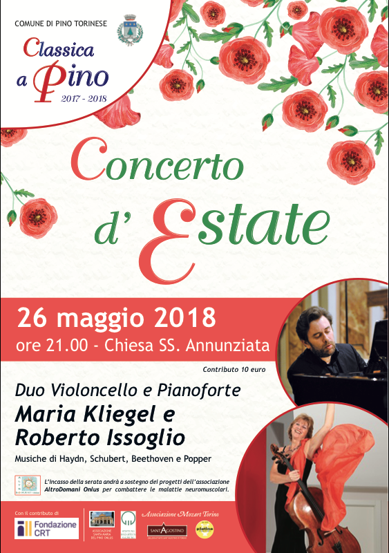 Si terrà sabato 26 maggio l’ultimo concerto di “Classica a Pino”. La celebre violoncellista tedesca, Maria Kliegel, e il talentuoso pianista torinese, Roberto Issoglio, si esibiranno sulle note di Schubert, Haydn, Beethoven e Popper, presso la Chiesa SS. Annunziata di Pino Torinese alle ore 21. Mstislav Rostropovich, violoncellista e direttore d’orchestra russo naturalizzato statunitense, considerava Maria Kliegel la miglior violoncellista che avesse ascoltato dopo Jacqueline du Pré. La musicista tedesca, infatti, dopo gli studi con János Starker presso l’Università dell’Indiana a Bloomington, ha vinto numerosi concorsi internazionali (Chicago, Bonna, Concorso Aldo-Parisot in Brasilia, Concorso Rostropovich a Parigi) e ha suonato in tutti i continenti. Si è dedicata con impegno instancabile alla musica contemporanea eseguendo e registrando in prima assoluta opere di Alfred Schnittke e Sofia Gubaidulina piuttosto che il brano “Hommage à Nelson Mandela” di Wilhelm Kaiser-Lindemann. Inoltre è stata membro di giuria in numerosi concorsi internazionali.