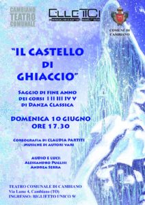 Domenica 10 giugno alle 17,30 andrà in scena il saggio di fine anno dei corsi I, II, III, IV e V di danza classica dal titolo “Il castello di ghiaccio”. Le piccole danzatrici, sapientemente coreografate dall’insegnante Claudia Partiti, vi porteranno in un musical fantastico dove tra danze, canti e parti recitate vi faranno vivere un sogno bellissimo. Collaborazione audio e luci di Alessandro Puglisi e Andrea Serra.