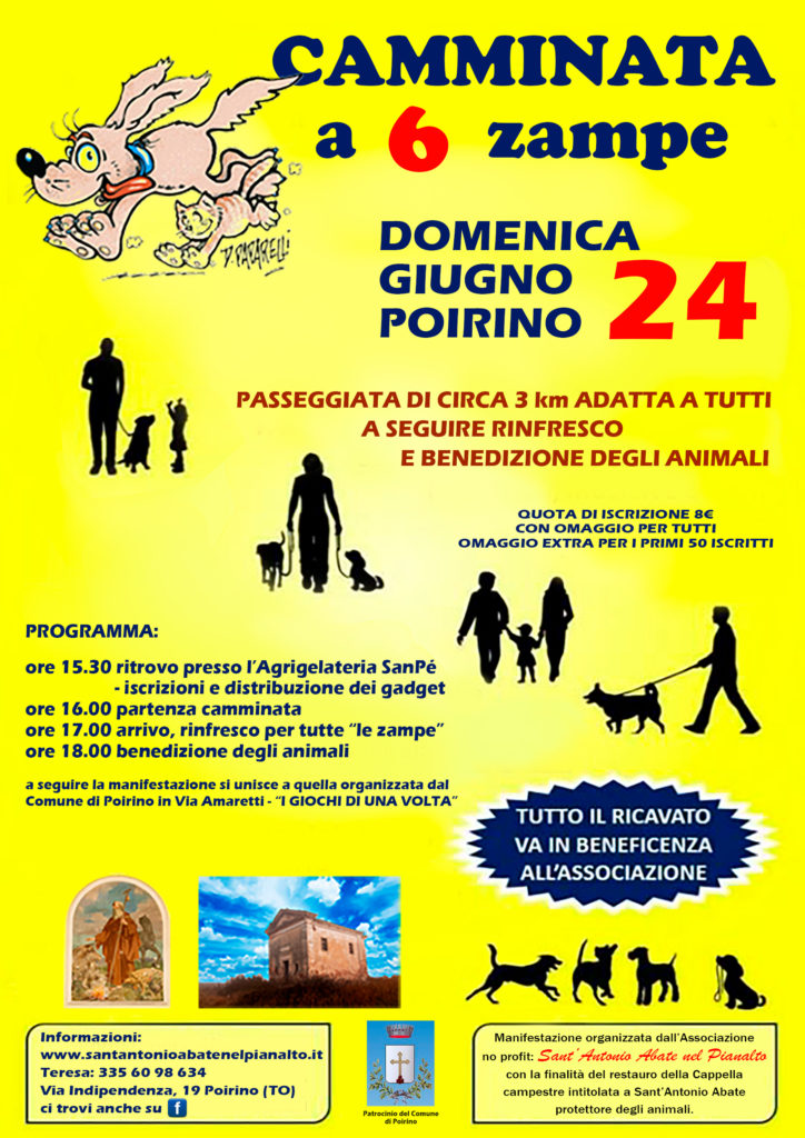 A Poirino si è costituita da poco l’ associazione no profit “Sant’Antonio Abata nel Pianalto”, che ha lo scopo di ristrutturare una chiesetta alla periferia di Poirino che è dedicata a Sant Antonio Abate, protettore degli animali. “Allo scopo di recuperare fondi – spiega Giovanni Criveller – organizziamo eventi che hanno gli animali come protagonisti, per esempio domenica 24 giugno organizziamo una camminata di 4 Km con i cani per arrivare alla chiesetta dove ci sarà una breve funzione con la benedizione per i nostri amici.”