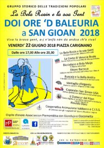 Il Circolo Beni Demaniali con il suo Gruppo Storico-Folk “La Bela Rosin e la soa Gent”, nel contesto dei festeggiamenti di San Giovanni, propone per il 6° anno consecutivo una rassegna di Gruppi Storici e Folk su pedana, in Piazza Carignano il 22 giugno 2018.