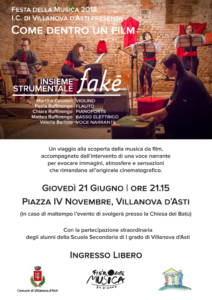 Giovedì 21 giugno in tutta Europa ricorre la Festa della Musica, manifestazione che si svolge ogni anno e costituisce un importante momento di aggregazione sociale e rafforzamento dei valori di cittadinanza europea, attraverso eventi musicali, anche spontanei, promossi da associazioni, gruppi musicali, singoli artisti o cittadini. Per l’occasione l’Istituto Comprensivo di Villanova d’Asti, con il patrocinio del Comune di Villanova d’Asti,  offre agli alunni e a tutta la popolazione un concerto-spettacolo dal titolo “Come dentro un film”, proposto dall’Insieme Strumentale Faké (Paola Ruffinengo, flauto traverso; Martina Cavaleri, violino; Chiara Ruffinengo, pianoforte; Matteo Ruffinengo, basso elettrico; Valeria Bertolo, voce narrante): un viaggio alla scoperta della musica da film, accompagnato dall’intervento di una voce narrante per evocare immagini, atmosfere e sensazioni che rimandano all’originale cinematografico. Il concerto si terrà giovedi 21 giugno alle ore 21,15 nella Piazza del Comune di Villanova (Piazza IV Novembre) o, in caso di maltempo, nella Chiesa dei Batù. Per coinvolgere i ragazzi in prima persona nella Festa della Musica, il concerto sarà aperto da una breve esibizione di canzoni e musiche eseguite da una rappresentanza di studenti delle classi prime e seconde, non impegnate negli esami di Stato. L’intento è quello di uscire dall’edificio scolastico per incontrare il territorio circostante e la popolazione, promuovendo la cultura e valorizzando talenti e passioni.