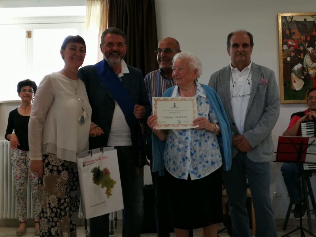 Celestina Gavello, classe 1918, nata il 5 giugno a Montemagno, è la dodicesima centenaria dell’anno insignita dell’attestato di “Patriarca dell’Astigiano”. E’ ospite presso la Casa di Riposo Rinetti di Montemagno dove, domenica 10 giugno è stata festeggiata con una cerimonia organizzata dalla direttrice Barbara Concone e dallo staff della struttura. La signora Celestina nasce da famiglia di contadini, si sposa con Giovanni che svolge l’attività di sarto. Collabora con lui dedicandosi alla riparazione dei capi di vestiario. Putroppo rimane vedova giovane, senza figli, pur amando moltissimi i bambini, e continua a svolgere l’attività del marito, dedicandosi anche ad opere di volontariato, aiutando in particolare la Parrocchia, i vicini di casa e conoscenti. A portarle il saluto istituzionale della Provincia di Asti, il Consigliere Mario Vespa, in presenza del Sindaco di Montemagno Claudio Gotta. Il Consigliere Vespa le ha consegnato la pergamena di “Patriarca dell’Astigiano” unitamente agli auguri del Presidente Marco Gabusi, l’omaggio di alcune pubblicazioni della Provincia e dell’Amaro del Centenario, della ditta Punto Bere di Canelli, partner nell’iniziativa. “La signora Celestina – dichiara il Consigliere Provinciale Mario Vespa – è un aiuto prezioso per la struttura: aiuta in stireria, ripara la biancheria degli ospiti e si dedica alla cura degli arredi della Cappella. Le rinnoviamo gli auguri per l’importante traguardo raggiunto contraddistinto da una vita semplice ma ricca di valori umani”.