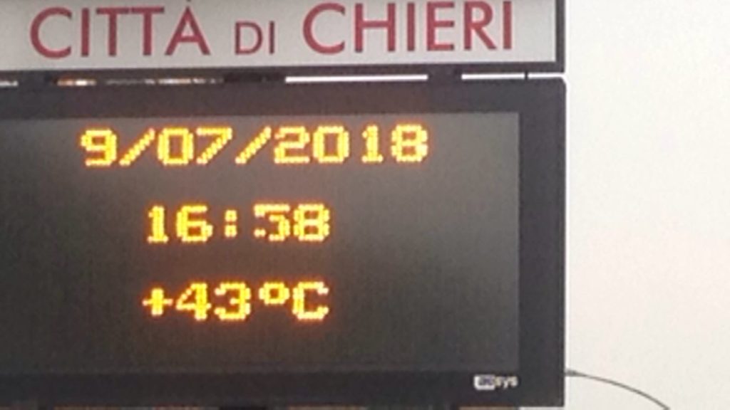 A Chieri va in tilt uno dei tabelloni luminosi installati dal Comune, che segnala poco dopo le 18 niente meno che 43 gradi di temperatura. “Per fortuna – ci segnala una concittadina con sottile ironia, mandandoci queste due foto – c’è qualcosa di sbagliato: siamo a Chieri, sono le 18 e 12 e la temperatura esterna raggiunge i 24°…”
