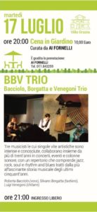 Dopo le prime due serate di grande successo, eccoci al giro di boa per Estate a Pino 2018! Eccoci al terzo appuntamento di Estate a Pino 2018: martedì 17 luglio sul palco i BBV Trio, un percorso nella storia musicale tra soul, rock, jazz e r&b con tre musicisti di assoluto livello! Ingresso libero. Lo spettacolo sarà preceduto dalla Cena in giardino, Villa Grazia, organizzata da “Ai Fornelli”, dal costo di 10€. Prenotazioni allo 011.843259