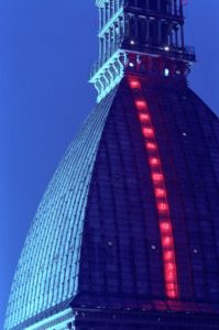 Il ‘volo dei numeri, opera dell’artista Mario Merz ispirata alla serie di Fibonacci, collocata sulla cupola della Mole Antonelliana nel 2000, resterà d’ora in poi costantemente accesa, dall’imbrunire di ogni giorno fino all’una d’estate e a mezzanotte d’inverno. I numeri “in volo” nell’installazione di Merz sono quelli della serie di Leonardo Pisano, detto Fibonacci. Il matematico medievale toscano – che introdusse tra l’altro in Italia l’uso delle cifre arabe – così sintetizzava la progressione che, in natura, determina la crescita e la proliferazione delle forme: in questa successione, ogni numero è la somma dei due precedenti. L’artista ha più volte utilizzato la serie di Fibonacci come elemento delle sue installazioni; allo stesso modo, è stato fra i primi ad assumere la luce fluorescente come metafora dell’energia. Qui, però, la successione numerica assume nuovi significati sia come forte segnale luminoso disposto sulla Mole, sia in rapporto alla curva (altro schema di frequente utilizzazione matematica) della cupola della costruzione di Antonelli.