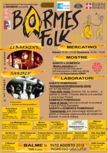 “Barmes Folk” (16° edizione) è una rassegna di carattere musicale e culturale che si svolgerà a Balme TO (Valli di Lanzo) sabato 11 agosto e domenica 12 agosto 2018. Balme è il più alto e più piccolo paese delle Valli di Lanzo, villaggio alpino al confine con la Savoia, piccolo insediamento di alta quota annidato alla base di altissime rupi di solcate da cascate. L’evento è organizzato dall’associazione Culturale Francoprovenzale “Li Barmenk”, nome che indica bensì gli abitanti di Balme ma significa propriamente “coloro che abitano i ripari sotto le rocce” nell’antico patois, ancora parlato in queste valli.Tre giorni per scoprire la storia di una piccola comunità fondata da pastori savoiardi nel medioevo, cui si aggiunsero poi i minatori bergamaschi e valsesiani. Quando le miniere di ferro si esaurirono i Balmesi vissero di un faticoso e pericoloso commercio con la Savoia, attraverso un valico a 3200 metri di quota. Divennero così alpinisti provetti, fino a trasformarsi in guide alpine quando i primi alpinisti si affacciarono in queste valli. Una storia raccontata all’Ecomuseo delle guide alpine che nei giorni della manifestazioni rimarrà aperto per chiunque desideri visitarlo. Un bagno di cultura di musiche e tradizioni che richiamerà gruppi musicali locali, danzatori provetti e principianti, valligiani autentici e cittadini amanti di una certa montagna, quella vera, sempre rude e talvolta un po’ ruspante.