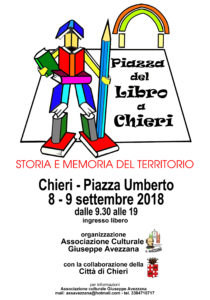 Nata da un’idea dell’associazione “Giuseppe Avezzana” di Chieri, subito appoggiata dal Comune, la manifestazione “Piazza del libro a Chieri. Storia e memoria del territorio” ha incontrato il favore di coloro che nel territorio a vario titolo si occupano di libri e l’8 e 9 settembre prossimi saranno in piazza Umberto a Chieri per incontrare la gente. Per due giorni, dal mattino alla sera, l’antica piazza delle Erbe ospiterà le Associazioni, le Case Editrici e le Biblioteche locali che presenteranno le loro pubblicazioni e le loro iniziative. Contemporaneamente si succederanno gli interventi di persone appassionate alla “storia e memoria del territorio”, che trasmetteranno ai visitatori l’amore e l’interesse che li motivano. E poiché tutti noi amiamo i libri e siamo convinti sostenitori degli effetti benefici della lettura, a coloro che nei due giorni compreranno un libro, e anche a chi presenterà uno scontrino emesso l’8 o il 9 settembre da negozi e pubblici esercizi di Chieri, doneremo un libro a scelta fra i tanti che le Biblioteche, le Case Editrici, le Associazioni e gli amici hanno messo a disposizione. I libri in dono saranno esposti in un apposito spazio al centro della piazza e saranno distribuiti fino a esaurimento della disponibilità.