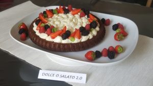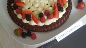 L’esito è stato un dolce che evidenzia un piacevole contrasto fra l’amaro del cioccolato, il dolce della crema e la nota acidula dei frutti.