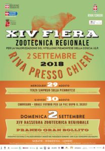 Domenica 2 settembre, a Riva presso Chieri, torna la fiera zootecnia regionale. Nei giardini di Palazzo Grosso dalle ore 8.00 alle ore 13.00 si terrà l’esposizione e la gara dei capi di razza bovina piemontese. Le iniziative partiranno però da mercoledì 29 agosto, alle ore 20.00, con il “Terzo Simposio sulla Piemontese” riguardo al ruolo della carne nella dieta salutare. Si proseguirà giovedì 30, alle ore 20.30, con il convegno, organizzato da Coldiretti Torino, “Quale futuro per la pac dopo il 2020?”