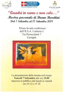 In occasione della festa di fine estate che la Casa di riposo Umbero I di Cuorgnè organizza per domenica 9 settembre, la struttura ospita, nella sala conferenze (via Perrucchetti 7) fino al 17 settembre, un importante evento culturale: la mostra personale di Bruno Barettini dal titolo “Quadri in rame e non solo.L’inaugurazione dell’esposizione dell’artista, anima creativa, tra le altre cose, del Gruppo spontaneo di artisti indipendenti, movimento culturale che da sempre contribuisce all’organizzazione di eventi all’interno dei festeggiamenti del Torneo di Maggio alla corte di re Arduino, è prevista venerdì 7 settembre alle ore 15,00.La mostra resterà aperta al pubblico sino al 17 settembre con orario dal lunedì al venerdì 10-12 e 15-18.