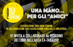 L’Associazione Area Bene Comune ha in programma delle azioni concrete per il riordino e il mantenimento dell’Area Ex-Tabasso. Sabato e Domenica 15 e 16 settembre si inizia collaborando con l’Associazione Amici della Biblioteca per riordinare e catalogare i libri in deposito al piano terreno dello stabilimento. Verranno riposizionati in un’altra zona già attrezzata con gli scaffali.  Sappiamo che molte persone condividono il nostro intento di cittadinanza attiva e dunque vi invitiamo a partecipare ed a coinvolgere altri che vogliano dedicare un po’ del loro tempo a questa iniziativa: più siamo, maggiore il risultato e minore la fatica! Per una migliore organizzazione potete segnalare la vostra preferenza per un giorno o per l’altro o tutti e due in questo doodle: