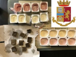 In virtù di questo strano comportamento, nonostante la merce da consegnare non presentasse evidenti difformità, gli agenti concentravano la loro attenzione su due confezioni da 8 vasetti di yogurt alla frutta. Eliminato il cartone che li racchiudeva ed analizzando i vasetti ad uno ad uno, gli agenti avevano la percezione che il peso di molti di essi fosse maggiore di quello indicato. Alcuni presentavano, inoltre, piccole irregolarità nella sigillatura. Pertanto, tutti i vasetti venivano aperti, consentendo il rinvenimento celati all’interno dei vasetti insieme allo yogurt, di 9 pezzi di sostanza stupefacente, di tipo hashish, per un peso di 105 grammi.
