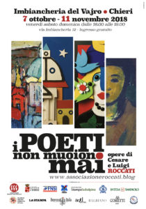 La Mostra “I Poeti non muoiono mai”, promossa dall’Associazione Cesare e Vigin Roccati, è stata realizzata in collaborazione con: Città di Chieri, FNSI (Federazione Nazionale Stampa Italiana), Ordine dei Giornalisti del Piemonte, Associazione Stampa Subalpina, Circolo della Stampa di Torino, Intesa SanPaolo, Accademia Albertina di Belle Arti di Torino, La Stampa, Fondazione Benvenuti in Italia, ADD Editore, Balbiano, Cossetti, Banca del Tempo.
