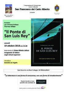 Il Centro Culturale “San Francesco del Carlo Alberto” invita all’incontro che avrà luogo venerdì 19 ottobre alle ore 21 presso la Sala Zaccaria in via Real Collegio 28 a Moncalieri: “Il ponte di San Luis Rey” di Thornton Wilder, Premio Pulitzer nel 1928 Intervento di Anna Maria Laface, insegnante di Lettere negli Istituti Superiori. Introduce Graziella De Angelis.La letteratura è una forma di conoscenza, non una forma di intrattenimento.