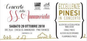 A Pino Torinese, Concerto dedicato alla SS. Annunziata, sabato 20 ottobre, alle ore 20,45, in Chiesa. Si esibiranno le eccellenze pinesi, precisamente: introduzione con GLI ALLIEVI DELLA Sezione Musicale della Scuola media di Pino, a seguire, la CORALE PINESE DI MARIO TENTO, proseguendo, l’organista ALESSIO GOLZIO, propone musiche all’organo. Al termine, la FILARMONICA PINESE, diretta dal M° Ermanno Lisa.