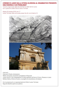 Sabato 20 ottobre alle ore 17,00 presso la Sala comunale ex ATL, Via Umberto I, 19 a Lanzo T.se ‘incontro sul tema “L’Eremo di Lanzo dalla storia gloriosa al drammatico presente: una risorsa o un problema?”, organizzato dalla Società Storica delle Valli di Lanzo con il patrocinio della Città di Lanzo Torinese. Il pregevole monumento, eretto nel XVII secolo e raffigurato in una tavola del Theatrum Statuum Sabaudiae, versa infatti in condizioni di abbandono. Come già avvenuto in occasione della Giornata FAI di Primavera del 2008, la nostra Società vuole farsi parte attiva nel sensibilizzare i rappresentanti delle istituzioni e l’opinione pubblica sull’importanza culturale, storica e artistica dell’Eremo dei Camaldolesi, così da promuovere la ricerca di soluzioni e risorse che consentano l’avvio dei necessari interventi di recupero.