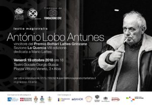Venerdì 19 ottobre alle ore 18 l’autore portoghese António Lobo Antunes, vincitore del Premio Bottari Lattes Grinzane per la sezione La Quercia, intitolata a Mario Lattes, terrà una lectio magistralis al Teatro Sociale di Alba, introdotta da Gian Luigi Beccaria e Laura Pariani.