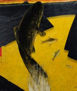persone dietro ai rettangoli delle finestre mute. E i mattoni costituiscono alcuni aspetti dell’esperienza di Johannes Pfeiffer, che Andrea Balzola ha definito «muratore e fabbro di installazioni», dove il «mattone, di preferenza manufatto artigianale, é il modulo cellulare delle sue forme». Forme che appartengono alla natura, a quel suo disegnare lo spazio con cavi di fibra sintetica, all’incontro con il granito «Un metro cubo», esposto nel parco del Castello di Racconigi, durante la Biennale Internazionale di Scultura del 2013. E sono interventi e situazioni liriche che ricreano la struttura di Santa Maria del Monastero-La Manta o il Museo dell’Opera del Duomo a Pisa. I fili di nylon diventano fasci di luce che illuminano l’interno di una antica navata, il cortile del Rettorato dell’Università torinese, e compongono, in «E la nave va», un omaggio a Giovanni Falcone. Per Giorgio Ramella l’Omaggio a Hokusai», è il filo conduttore di una ricerca in cui si delinea il suo viaggio verso l’Oriente. E i segni graffiti, l’attenzione per il maestro de «La grande onda di Kanagawa» (dalle «Trentasei vedute del Monte Fuji»), l’energia della rappresentazione, richiama i versi haiku del giapponese Fujiwara No Sadaie: «un banco di nubi/ si staccava dalla/ vetta del monte». Ramella affida alle immagini il senso di una «scrittura» dove vi è tutto il suo «immaginario come fossero fotogrammi di un racconto»(Lea Matterella). E sono nuvole lievi, aquiloni, alberi appena definiti e pesci che risalgono la corrente d’acqua, che conferiscono alla narrazione il fascino di un tempo lontano che riemerge con la forza del dato cromatico, del ricordo, di una stagione creativa che magicamente affiora dall’Oriente.