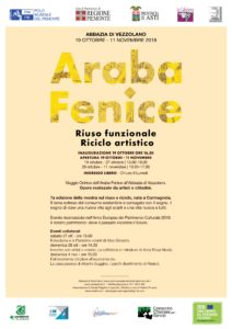 Espongono a Vezzolano: Giulio Agostino, Rita Bo, Gabriella Chiminello, Daniela Evangelisti, Roberto De Fanti, Gianni Depaoli, Margherita Fantini, Irma Fava, Margherita Fergnachino, Caterina Fiore, Mario Giammarinaro, Gianni Gianasso, Antonio La Colla, Giancarlo Laurenti, Angelo Lussiana, Maurizio Rivetti, Marco Roascio, Adriano Rosso, Marilde Saliani, Daniela Santucci, Claudia Scalera, Annarita Serra, Alice Silvestro, Cristina Tomaini, Anna Torazza. La VII edizione della mostra l’Araba Fenice è un Viaggio Onirico, intrapreso nel 2018 e che ha portato prima a Cambiano (16 settembre) e poi all’Abbazia di Vezzolano, È stato organizzato dall’Associazione Culturale Peppino Impastato in collaborazione con il Comune di Cambiano, il Mibac Polo Museale del Piemonte e l’Associazione La Cabalesta. “L’Araba Fenice: Riuso Funzionale Riciclo Artistico 2018” ha ottenuto il logo dell’Anno Europeo del Patrimonio Culturale 2018. Ha ottenuto il patrocinio della Regione Piemonte, Torino Città Metropolitana, Provincia di Asti, CCS- Consorzio Chierese per i Servizi, Abbonamento Musei, Turismo Torino e Provincia, Legambiente Circolo il Platano e l’Associazione InCollina. La mostra, curata da Valeria Torazza, conserva l’impronta ideale di Gianni Cavallini, che è stato Assessore alla Cultura del Comune di Carmagnola, socio fondatore dell’Associazione Culturale Peppino Impastato e promotore dell’iniziativa. Apertura al pubblico dell’esposizione all’Abbazia di Vezzolano: 19 ottobre – 11 novembre 2018 Inaugurazione: 19 ottobre ore 16.30 Apertura: 19 – 27 ottobre da martedì a domenica ore 10.00 – 18.00 28 ottobre -11 novembre da martedì a domenica ore 10.00 – 17.00