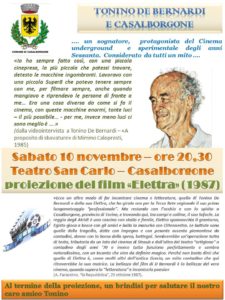 Protagonista del cinema underground e sperimentale, Tonino De Bernardi presenta sabato 10 novembre, alle 20,30, al Teatro San Carlo di Casalborgone il suo film «Elettra» del 1987, che «è la bellezza del vero cinema, quando supera la «letteratura» e incontra la poesia» (A. Farassino, su «La Repubblica» del 23 ottobre 1987). Un momento, quindi, di scrittura cinematografica, di ricerca, di una misura espressiva che appartiene al suo lungo impegno di autore, che ha fondato e gestito la casa di produzione torinese Lontane Province Film a Casalborgone, dove vive, lavora e ha insegnato Lettere. E da «Vaso etrusco» del 1967 a «Serva e padrona» del 2005, si snoda un percorso che nel 2017 è approdato alla Videoteca GAM con l’opera «Il nostro verde» (1967) di Tonino De Bernardi e Paolo Menzio, inserita nel ciclo di mostre dedicate al cinema sperimentale italiano degli anni ‘60 e ‘70. L’opera, che è stata donata alla collezione del museo, nasce dall’incontro con Taylor Mead che prese parte alle riprese. In particolare, nella scena finale risuonano le parole di «Howl» di Allen Ginsberg: «Ho visto le menti migliori della mia generazione/ distrutte dalla pazzia, affamate nude isteriche». Tra gli interpreti si ricordano Pia Empremian e i poeti concreti Adriano e Maurizio Spatola che hanno lasciato una traccia inconfondibile della loro esperienza. Una stagione che vide attive personalià come Arrigo Lora-Totino o il pittore e poeta visivo Dino Bedino che ha scritto i versi:«Anche la vita è come un adieu sospeso/ rinviato a quell’Ora, a quel Viaggio in cui non serve valigia o passeport/ ma i segreti del cuore/ la prière che è nel libro della memoria…./(oh non lasciarla appassire…». La serata per «Elettra» restituisce alcuni degli aspetti del percorso innovativo e interiorizzato del linguaggio di Tonino De Bernardi, l’essenza di una visione culturale e creativa che ha preso forma attraverso la frequentazione del Gruppo 63 di Edoardo Sanguineti, le suggestioni dell’Action Painting e della Pop Art, e del profondo interesse per il cinema: «Filmavo volti, perché nei volti c’era già tutto».