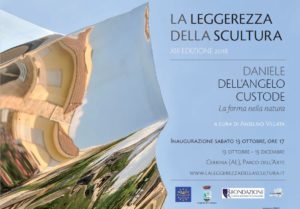 Il 2018 vede la realizzazione della tredicesima edizione della mostra annuale “La leggerezza della scultura” che si svolge fino al 15 dicembre vedrà la mostra personale di Daniele dell’Angelo Custode le cui opere saranno accolte nel Parco dell’Arte di Cerrina. Questo luogo risulta particolarmente idoneo ad accogliere sia le opere che per il pubblico che con esse interagisce, dove natura e creatività artistica si incontrano e dialogano generando un’atmosfera particolarmente suggestiva, anche e soprattutto per i materiali impiegati che inglobano e deformano (o ri-formano) il paesaggio circostante rendendolo un corpo unico con le forme scultoree. Originario di Nardò, in provincia di Lecce, l’artista ama la luce e con essa ci gioca, stuzzicandola e catturandola per modellarla dentro le sue opere. Per rendere ancora più efficace l’unione tra scultura e paesaggio, soprattutto l’azione e il variare luminoso, Daniele dell’Angelo Custode impiega, in modo preferenziale, due materiali assolutamente in antitesi nel risultato finale, ossia l’acciao corten e l’acciaio lucido. Il primo è opaco, ruvido, assorbente i raggi luminosi, ma le sculture con questo realizzate presentano superfici piane, piuttosto estese, interrotte da forme “vuote” che lasciano vedere al di là, cosicché la realtà ambientale diventa parte integrante della scultura e si confronta con l’iconografia geometrica e astratta dell’opera, mettendo in atto un certo razionalismo
