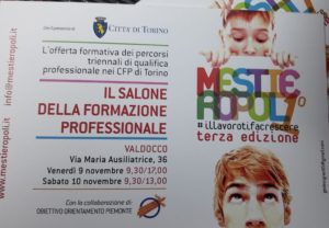 Venerdì 9 novembre dalle 9,30 alle 17,00 e Sabato 10 dalle 9,30 alle 13,00 presso Cnos Valdocco, in Via Maria Ausiliatrice, 36   a Torino si svolgerà la terza edizione del salone dell’orientamento della formazione professionale dedicata ai ragazzi che frequentano la terza media e sono prossimi alla scelta del loro futuro scolastico (scadenza iscrizioni 31 gennaio). In questa kermesse parteciperanno le agenzie formative della Città Metropolitana con la collaborazione di Obiettivo Orientamento Piemonte, il servizio della Regione dedicato all’orientamento scolastico/formativo. Ogni agenzia, accompagnata da propri allievi più grandi, presenterà attraverso materiali, locandine e oggetti le proprie specificità. (F.M.)