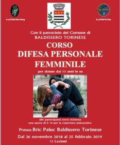 Il corso sarà tenuto dal M° Massimo Carrara dell’Associazione Club Dien Hong a.s.d. di Pino T.se. Le lezioni insegnano tecniche semplici ed efficaci derivate dal Viet Vo Dao, Judo, Ju-Jistu e Aikido e prevedono esercitazioni in coppia con alternanza nei ruoli di vittima e aggressore. Le tecniche di legittima difesa permettono di acquisire maggiore consapevolezza di sé, aiutando a riconoscere e valutare le situazioni di pericolo e come evitarle o affrontarle. In una prospettiva più ampia, verranno presi in considerazione anche gli aspetti psicologici delle aggressioni, per poter cogliere tutte le strade che si presentano per la risoluzione non violenta dello scontro. Durante il corso saranno altresì trattati temi dei maltrattamenti, della legittima difesa e illustrati principi di diritto e psicologia.
