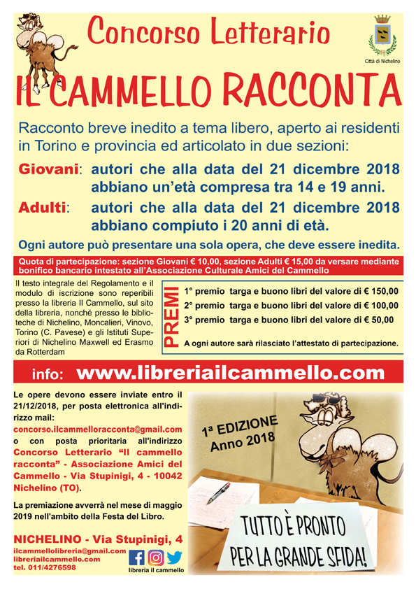 Nichelino, concorso letterario “Il Cammello racconta” di Redazione · 13 Novembre 2018 A Nichelino, parte il 1° Concorso Letterario promosso dall’Associazione Amici del Cammello. Visto da: 66