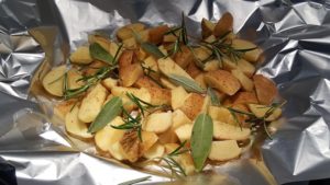 1. Spazzolate accuratamente le patate e tagliatele in quarti, lasciandole con la buccia. Conditele con abbondante olio, sale e pepe. Disponete le patate su un foglio di alluminio abbastanza grande da poter essere chiuso a cartoccio e cospargete le patate con le erbe aromatiche, Aggiungete lo spicchio d’aglio in camicia, dopo averlo schiacciato leggermente.