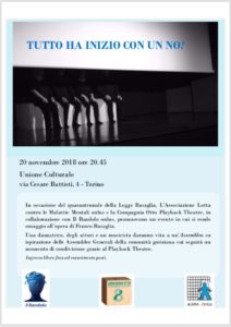 Martedì 20 novembre alle 20.45 “TUTTO HA INIZIO CON UN NO!” appuntamento all’Unione Culturale di Via Cesare Battisti, 4 a Torino. L’Associazione per la Lotta Contro le Malattie Mentali – onlus e la Compagnia OttO, in collaborazione con noi, promuovono un omaggio all’opera di Franco Basaglia e alla sua idea di società aperta e inclusiva. Il programma prevede un reading di poesie, riflessioni miscelati ai suoni, alla musica e alla danza con Arcangela Cursio, Enrico Lamendola: attori. Cristiano Lo Mele: musica_suoni. Roberta Quarzi: danzatrice. E poi una performance di Playback Theatre: improvvisazione teatrale basata sulla circolarità d’interazione fra artisti (conduttore, attori e musicisti) e pubblico… un’azione creativa di lotta allo stigma e al pregiudizio.