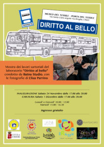 Sabato 24 Novembre 2018 nella sede del museo del tessile – Porta del Tessile a Chieri in via Santa Clara angolo via Broglia. Le porte apriranno al pubblico dalle 17.00 fino alle 20.00 di sabato sera. Alcuni dei partecipanti del Punto Rete area Caselli, del consorzio dei Servizi Socio – Assistenziali del Chierese, hanno esplorato tutti gli aspetti del design di moda. Dalla ricerca iconografica alla progettazione, sino alla confezione finale degli abiti. Il percorso guidato dalle stiliste Arianna Merlo e Giulia Nota con il supporto delle educatici Monica Pinato e Manuela Conti, ha infine dato vita alla mostra dei lavori degli utenti, immortalati negli scatti della fotografa Elisa Parrino. Il progetto che si è svolto nell’atelier creativo “Scarto Matto” e nello studio Torinese delle BATNA, ha raccolto il materiale di scarto di alcune aziende del territorio della provincia di Biella, di Chieri e di Alba. Tra le ditte che hanno collaborato donando i loro scarti ci sono: la ditta Corte di Chieri, Tessitura Rivese di Riva presso Chieri, filatura di Trivero a Gaglianico (Biella), ditta Miroglio di Alba.