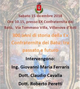Gli assessorati alla Cultura ed al gemellaggio del comune di Villanova d’Asti organizzano il convegno, “300 anni di storia della Ex Confraternita dei Batú: tra passato e futuro” che si terrà sabato, 15 dicembre alle ore 10:15 presso la Ex Confraternita dei Batù in Via Tommaso Villa, 3. Tra i relatori che interverranno, anche l’Assessore Regionale Giovanni Maria Ferraris.