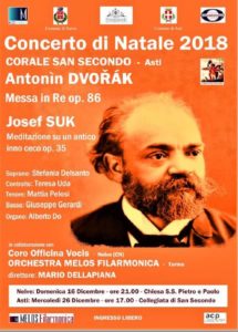 La Corale San Secondo di Asti, nell’ambito delle proprie attività musicali, ha organizzato, come consuetudine, il Concerto di Natale 2018, che si terrà in più sedi, con un programma ambizioso ed impegnativo incentrato sulla MESSA IN RE OP. 86 di ANTONÌN DVOŘÁK.Per l’esecuzione la Corale San Secondo si avvarrà della collaborazione del Coro Officina Vocis di Neive, dell’orchestra Melos Filarmonica di Torino e dei solisti: Stefania Delsanto (soprano), Teresa Uda (contralto), Mattia Pelosi (tenore) e Giuseppe Gerardi (basso), con la direzione del Maestro Mario Dellapiana.La prima esecuzione avverrà DOMENICA 16 DICEMBRE alle 21, a NEIVE (CN), nella Chiesa SS. Pietro e Paolo, a cui seguirà quella di DOMENICA 23 DICEMBRE alle 21 a CASTAGNOLE DELLE LANZE (AT), nella Chiesa di San Pietro in Vincoli e infine ad ASTI, nella Collegiata di San Secondo, MERCOLEDÌ 26 DICEMBRE alle ore 17.Tutte le manifestazione saranno ad ingresso libero.