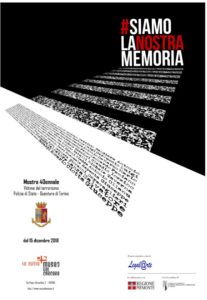 La mostra #Siamolanostramemoria, inaugurata lo scorso 4 maggio alla presenza del Capo della Polizia Franco GABRIELLI entrerà nel percorso espositivo permanente del Museo del carcere delle Nuove di Torino, via Borsellino 3 in occasione della celebrazione 40°ennale della morte per mano terroristica delle Guardie di Pubblica Sicurezza Salvatore Lanza e Salvatore Porceddu. “Le parole devono avere un peso ed un significato ed oggi dobbiamo ricordare chi stava da una parte e chi dall’altra… chi stava dalla parte giusta ed ha perduto la vita nel nome delle Istituzioni democratiche del Paese.” le parole del Capo della Polizia, Franco Gabrielli, racchiudono il senso del progetto espositivo. L’obiettivo è far conoscere, soprattutto alle giovani generazioni, i tragici avvenimenti che hanno segnato l’Italia degli anni di piombo con uno sguardo particolare a ciò che è accaduto nella lunga notte torinese degli anni ‘70.