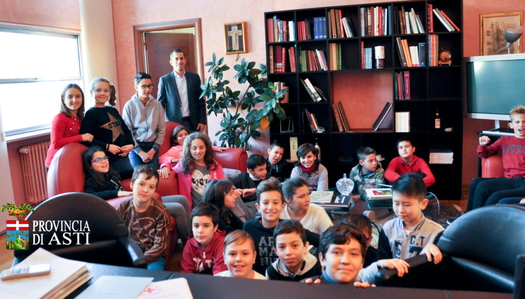 Il 3 dicembre 2018 dalle 11 alle 12,30 noi, la 5°B siamo andati a piedi alla sede della Provincia in P.zza Alfieri. Ci hanno accolto le signore Emiliana e Silvana, segretarie del Presidente della Provincia. La signora Emiliana ci ha condotti nella Sala Consigliare dove si riunisce l’Assemblea dei Sindaci dei 118 Comuni della Provincia di Asti, che abbiamo saputo essere fondata nel 1935; inoltre la nostra Provincia è a forma di grappolo d’uva. Poco dopo è arrivato il Presidente della Provincia Marco Gabusi che ci ha fatto notare che la nella Sala sono esposti alcuni degli stemmi dei comuni più grandi. Ci ha spiegato che le strade che uniscono i comuni fra di loro sono strade provinciali (la Provincia possiede 1200 km di strade), inoltre il Presidente della Provincia è anche sindaco di Canelli. Successivamente la segretaria ci ha fatto visitare la Sala Giunta dove si riunisce il Consiglio provinciale formato dal Presidente, da 10 Sindaci che lo aiutano, e dal Segretario Generale. Siamo entrati anche nell’ufficio del Presidente e salutato il Segretario della Provincia dott. Casagrande. La Provincia si occupa della manutenzione delle scuole superiori, di Protezione Civile, a proposito abbiamo visitato la sala operativa e il responsabile Mauro Rolla ci ha spiegato cose molto interessanti e abbiamo visto da dove chiamano anche i pompieri quando c’è un’ emergenza e decidono insieme cos’è meglio fare, anche con la Prefettura. Nella Sala Consigliare vi è il Gonfalone (con un nastro azzurro) decorato di medaglia d’oro al valor miliare per l’attività dei Partigiani durante la 2°Guerra Mondiale, invece il nastro azzurro è dello stesso colore della fascia che porta il Presidente durante le manifestazioni. Poi siamo andati nell’ufficio di Paola e Salvatore (politiche giovanili) che ci hanno informato sul campeggio estivo di Roccaverano con la piscina e tante attività all’aperto e giochi di gruppo e di avventure. Abbiamo visitato gli uffici della viabilità e quello dei conti, dove vengono gestiti i soldi per le decisioni più importanti. Ci è piaciuto molto andare alla sede della Provincia di Asti.