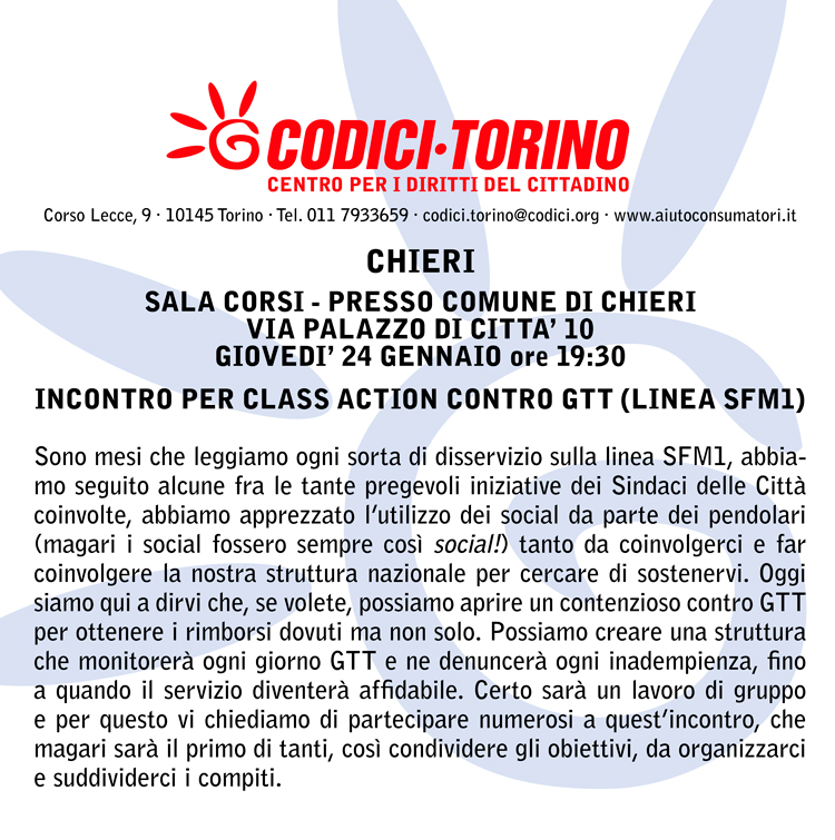 Giovedì prossimo, 24/01 ore 19,30 ci sarà un incontro a Chieri per valutare l’opportunità di un’Azione Collettiva contro GTT per i continui disservizi sulla linea SFM1 Pont-Rivarolo-Chieri.