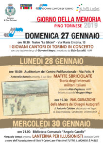 Il primo appuntamento si terrà domenica 27 gennaio, alle ore 18.30 presso il Teatro Le Glicini di Pino (via Maria Cristina 13), e vedrà protagonisti “I giovani cantori di Torino” in concerto, un coro giovanile misto, fondato nel 2012 dai Piccoli Cantori di Torino e diretto dal Maestro Carlo Pavese. Clandestini, migranti, nomadi, storie di chi parte e chi ritorna, nostalgie e prospettive, pregiudizi e sensibilità. Tutto questo è già successo e di nuovo si ripete, per questo lo raccontiamo nella nostra giornata della memoria, con parole e canzoni, con le voci dei giovani, che la memoria raccolgono e custodiscono. Forse ci aiuteranno dirigere il nostro sguardo più a fondo. A seguire, una testimonianza di Giovanni Negro, che sarà introdotto da Elda Gastaldi dell’ANPI.