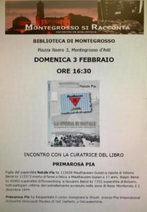L’appuntamento è per domenica 3 febbraio presso la Biblioteca “Enrico Paolucci” di Montegrosso d’Asti alle ore 16:30 con“La storia di Natale” da soldato in Russia a prigioniero nei Lager. La presentazione del libro sarà tenuta da Primarosa Pia, figlia di Natale Pia, superstite di Mauthausen-Gusen. Primarosa oltre a essere parente di 4 uomini deportati (il padre Natale e gli zii Vittorio, Biagio e Giovanni Benzi, tutti partigiani catturati durante il rastrellamento avvenuto nella zona di Nizza Monferrato il 3 dicembre 1944) ha frequentato il corso “Insegnare la Shoah” presso The International School for Holocaust Studies di Yad Vashem, tenuto a Gerusalemme.