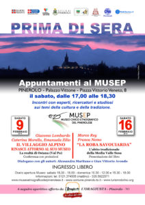 Di sabato e prima di sera. Il Museo Civico Etnografico del Pinerolese e l’associazione Centro Arti e Tradizioni Popolari invitano all’appuntamento con “Prima di sera”, una serie di incontri con studiosi, ricercatori, autori e appassionati dei temi della tradizione, della cultura popolare, materiale e immateriale, dell’etnografia. L’iniziativa, patrocinata dalla Città Metropolitana di Torino, è nata da un‘idea di Alessandra Maritano, Enrico Lantelme e Gian Vittorio Avondo – rispettivamente Presidente del MUSEP, musicologo e scrittore con un’attività nel museo – che apre alla possibilità di conoscere e sviluppare argomenti legati alla riscoperta dei territori, della quotidianità delle comunità fra lavoro e festa.