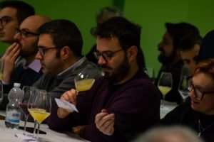 Si può facilmente immaginare quante possano essere le sfumature aromatiche che le combinazioni tra queste molecole possano produrre. Il percorso della genesi degli aromi si evidenzia, nel nostro esperimento, dal secondo campione in poi. L’uva Cortese sfecciata e non ancora fermentata rilascia il solo profumo della frutta fresca. Il terzo campione è una Barbera a metà fermentazione. Nel bicchiere si individuano aromi sgradevoli come la cimice schiacciata e il tipico odore “vinoso” che scomparirà nelle fasi successive della fermentazione. Ne sono responsabili gli alcoli superiori. Procedendo e passando al quarto campione, uva Cortese a metà fermentazione, cominciamo a​riconoscere un prodotto molto profumato dominato dall’aroma di banana: ne è responsabile il composto di acetato di isoamile. Verso la fine della fermentazione, con l’uva Cortese arrivata all’80% della trasformazione, si sviluppa già una maggiore complessità aromatica con note di banana, di frutta tropicale e di linalolo. Nell’ultima fase, a fermentazione completata, il bouquet odoroso è finalmente caratterizzato dalle note fruttate e da quelle erbacee combinate in maniera armonica che possiamo riconoscere come tipicità del vitigno.