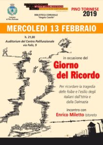 Nell’ambito delle iniziative promosse dall’Amministrazione Comunale per celebrare le ricorrenze civili nazionali per il “Giorno del Ricordo” è stato organizzato un incontro il Mercoledì 13 febbraio h. 21,00 con il dott. Enrico Miletto, storico.