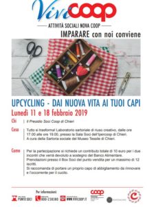 lunedì 18 febbraio, dalle 17 alle 19, la Sala Soci dell’Ipercoop di Chieri ospiterà il secondo incontro di “Upcycling – Dai nuova vita ai tuoi capi”, un breve corso per imparare a trasformare e a rendere alla moda vecchi capi di abbigliamento che non si usano più. Il corso è organizzato dal Presidio Soci di Coop in collaborazione con la Sartoria sociale del Museo Tessile di Chieri.