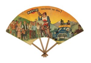 Il ventaglio promozionale nasce in Europa a metà Ottocento come veicolo di promozione turistica per alberghi, luoghi termali ed eventi, come le grandi Esposizioni nazionali e internazionali. Con l’inizio del ‘900 il ventaglio diventa strumento per pubblicizzare le più svariate tipologie di servizi e prodotti: il produttore di scarpe, il droghiere, le sale da ballo e le imprese di servizi, prime fra tutte quelle di onoranze funebri che lo utilizzano come biglietto da visita.