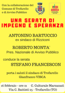 Il prossimo 16 febbraio alle ore 21, a Trofarello presso il Centro Culturale Marzanati, verranno a Trofarello Antonino Bartuccio ex sindaco di Rizziconi (comune della piana di Gioia Tauro) e Roberto Montà Presidente Nazionale di Avviso Pubblico che è l’associazione a livello nazionale che si occupa di informazione, formazione degli enti locali contro il fenomeno della criminalità organizzata . “Questa serata – dice uno degli organizzatori, Stefano Francescon – è stata pensata perché avviene dopo quella con Don Luigi Ciotti e perché siamo convinti che portare delle testimonianze vere e profonde di chi ogni giorno vive protetto perché lotta contro le mafie sia da stimolo affinchè ognuno possa fare la propria parte. Un incontro organizzato da un comitato locale di associazioni e volontari che, insieme al Comune hanno scelto di collaborare per questa serata. Per questo motivo si vogliono ringraziare il Comitato genitori che ci aiuterà nella comunicazione con i ragazzi e con le famiglie per meglio promuovere l’evento, la Croce Rossa e le Forze dell’Ordine che interverranno per garantire la sicurezza e l’assistenza della serata. La storia di Antonino Bartuccio ha davvero degli ottimi spunti di riflessione, sicuramente sarà una serata di speranza e coraggio; perché senza questi due elementi è difficile pensare di lottare ogni giorno, come ama dire lui la scelta più coraggiosa è quella di stare dalla parte dello stato sempre; perché così si può pensare di contrastare un fenomeno come quello della criminalità organizzata sempre più diffuso anche e soprattutto al nord Italia e anche il Piemonte non è esente da questo fenomeno.”
