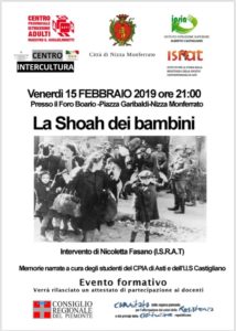 Venerdì 15 febbraio dalle 21, presso il Foro Boario Nizza Monferrato, è stata narrata“La Shoah dei bambini”, per non dimenticare.All’iniziativa per la Giornata della Memoria 2019 ci sono state le letture a cura degli studenti del CPIA 1 ASTI e I.I.S. Castigliano che hanno realizzato l’evento, in collaborazione con l’ISRAT di Asti e il Centro Intercultura, con il Comune di Nizza Monferrato, il Consiglio Regionale del Piemonte e il Comitato della Regione Piemonte. Nello spettacolo è intervenuto anche il Coro di San Paolo e dei bambini della scuola elementare Cagni di Asti.Ha preso la parola Nicoletta Fasano, ricercatrice dell’I.s.r.a.t e l’iniziativa è nata per celebrare il giorno della memoria e ha voluto portare alla luce la storia e le testimonianze dei bambini ebrei della provincia che subirono il dramma delle deportazioni e delle leggi razziali durante la seconda guerra mondiale. I bambini dell’Olocausto hanno rappresentato il segmento più vulnerabile tra i gruppi che furono colpiti dalle politiche naziste di discriminazione, persecuzione razziale e genocidio, con un altissimo numero di vittime. La stragrande maggioranza di loro (tra un milione e un milione e mezzo) furono ebrei e a loro ci si riferisce specificamente e più propriamente come bambini della Shoah. I bambini che furono oggetto di persecuzione e sopravvissero all’Olocausto, nei ghetti e nei campi di concentramento o nella clandestinità o attraverso la fuga e l’emigrazione forzata, passarono tutti attraverso esperienze molto dure di privazioni personali e di separazione o perdita delle loro famiglie. Nel dopoguerra molti di essi hanno svolto un ruolo importante di testimoni nei processi e di fronte all’opinione pubblica.Se nei territori occupati dai nazisti trovarono la morte i due terzi degli ebrei residenti, questa percentuale fu di gran lunga superiore tra i bambini. Lievemente maggiori furono le possibilità di sopravvivenza tra gli adolescenti, utilizzati come forza lavoro. Agli occhi dei nazisti i bambini rappresentavano solo delle bocche inutili da sfamare, al contrario degli adulti il cui lavoro o poteva essere sfruttato almeno per un certo periodo per le esigenze belliche della Germania. I bambini furono ovviamente tra i più esposti alle violenze dell’Olocausto. In tutto, si calcola che almeno un milione e mezzo di bambini e ragazzi sia stato ucciso dai Nazisti.Alcuni di loro, come Liliana Segre, si sono salvati e sono diventati testimoni dell’orrore. Molti morirono nei campi di sterminio, altri nei lager, molti ancora nei ghetti, dove la fame e il tifo decimarono migliaia di persone. Chi si salvò, come Elie Wiesel o Liliana Segre – nominata senatrice della Repubblica – diventati adulti, hanno raccontato e testimoniato l’orrore cui hanno assistito. Shoah in ebraico significa desolazione, catastrofe, disastro. Nonostante gli innumerevoli tentativi, il numero delle giovani vittime della Shoah nella seconda guerra mondiale, fu elevatissimo, sia dentro sia fuori i campi di concentramento. La Giornata della Memoria è un’occasione preziosa per ricordare la Shoah, per far sì che mai si ripeta una cosa simile. E ogni anno che passa, è fondamentale dare voce ai bambini. “Giorno della memoria” per ricordare la Shoah, la persecuzione degli Ebrei, ma anche di coloro che si sono opposti alla persecuzione a rischio della propria vita. Con questa legge lo Stato non può cancellare quello che è successo, ma può aiutarci a conoscere e a farci capire.Gli Ebrei sono stati perseguitati e il giorno della Memoria è il modo migliore per ricordare e riflettere perché tutti ci dobbiamo rispettare e amare, così come siamo. Inoltre, questo giorno fa nascere nei nostri cuori l’interesse per lo studio della storia e delle culture diverse dalla nostra. Solo con la conoscenza nasce il rispetto.